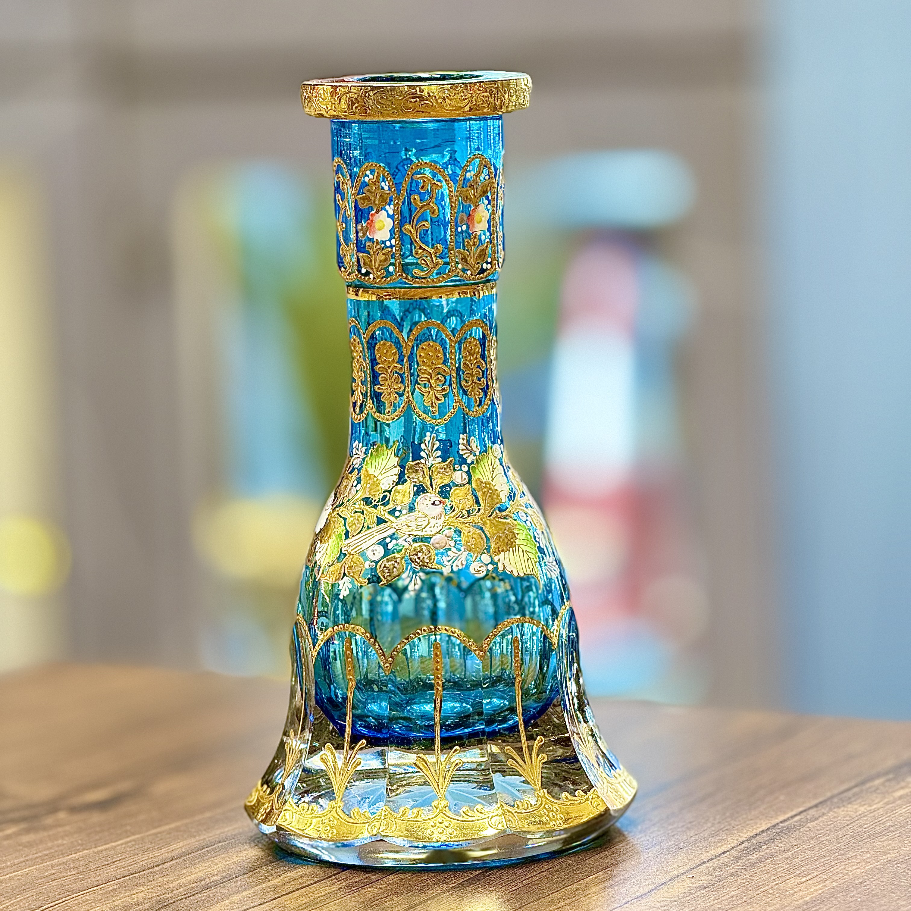 تنگ کریستال تراش نیمچه/نقاشی گل و مرغ/روکش آب طلای 24 عیار/مناسب تنه قلیان های ارتفاع 25 الی 50 سانتی متر/وزن شیشه 1400 گرم/ارتفاع شیشه 21 سانتی متر/اثر استاد مهرآوری